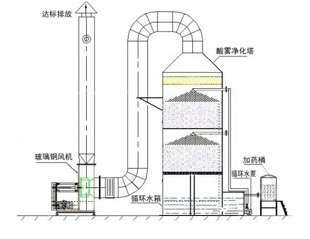 酸霧廢氣由風(fēng)管引入凈化塔,經(jīng)過(guò)填料層,廢氣與氫氧化鈉吸收液進(jìn)行氣液兩相充分接觸吸收中和反應(yīng),酸霧廢氣經(jīng)過(guò)凈化后,再經(jīng)除霧板脫水除霧后由風(fēng)機(jī)排入大氣。吸收液在塔底經(jīng)水泵增壓后在塔頂噴淋而下,最后回流至塔底循環(huán)使用。